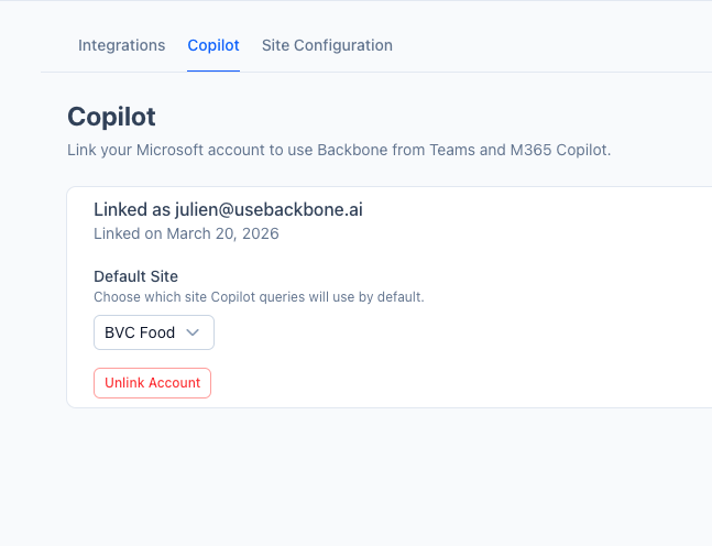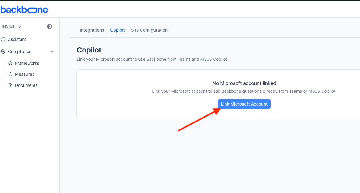 - Click on Link Account or Navigate to https://app.usebackbone.ai/settings/copilot