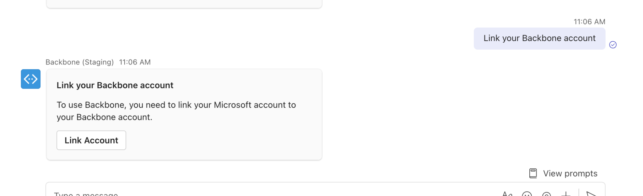 - Open a Chat in the Custom Agent select Link command or type in Link your Backbone account